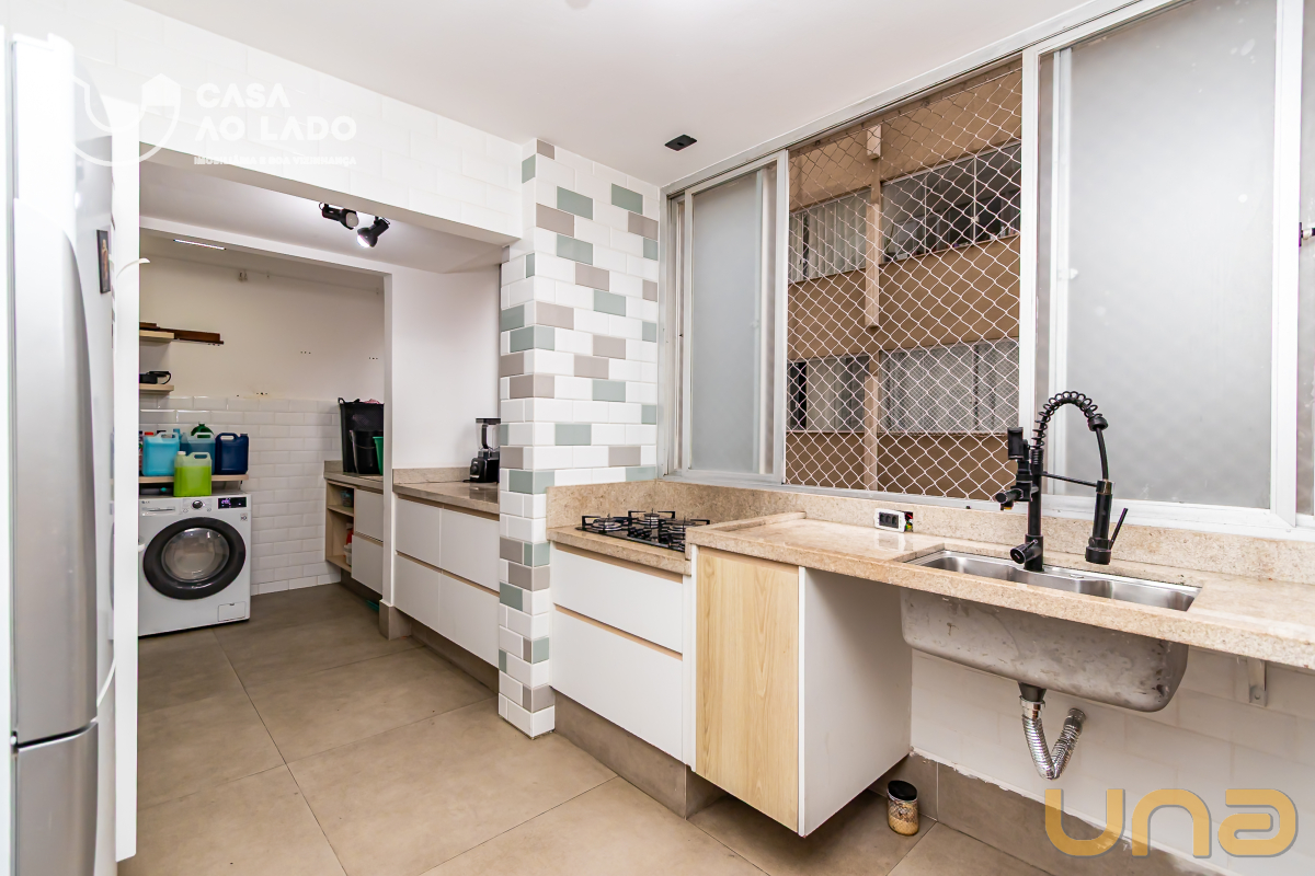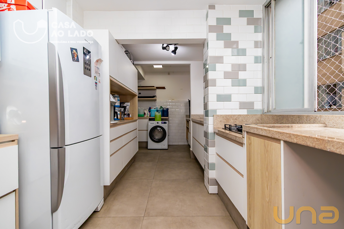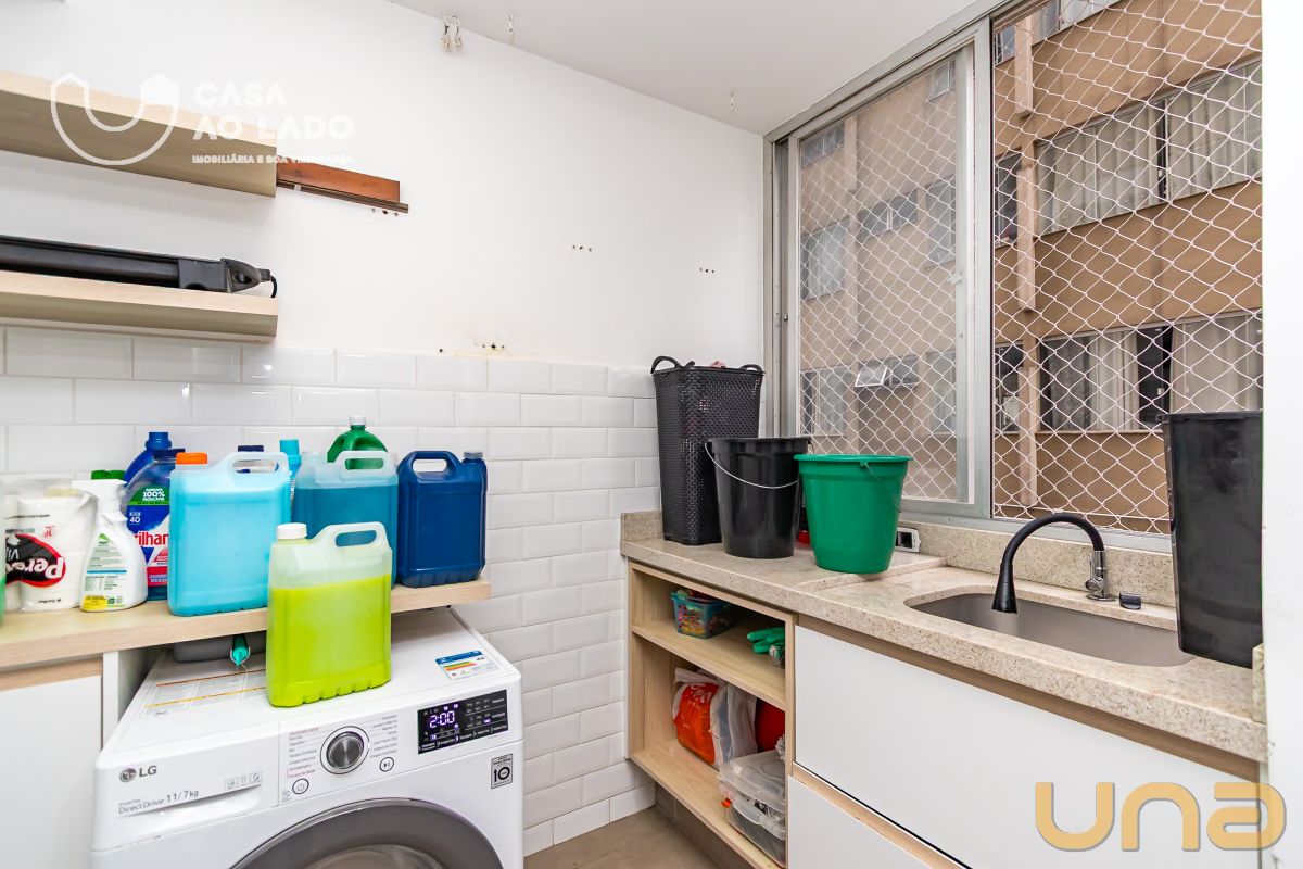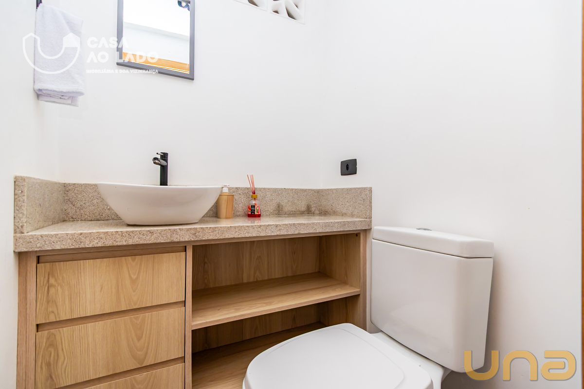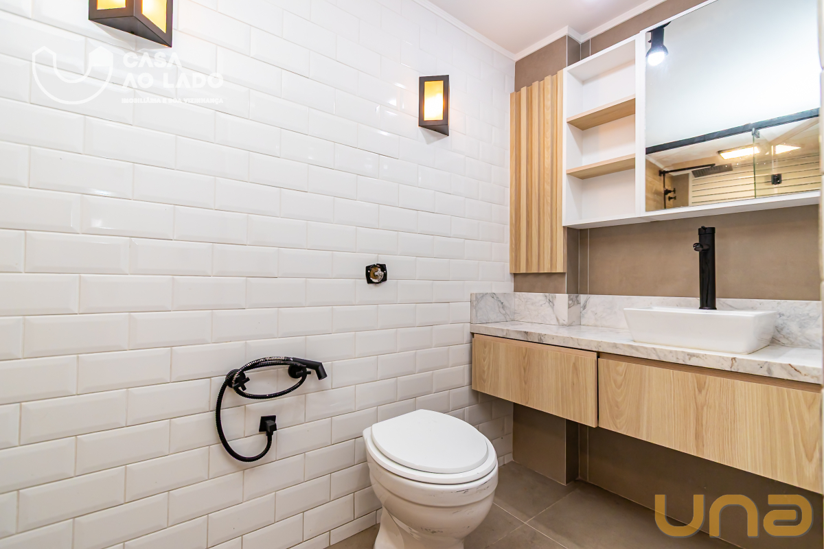 A área de serviço também possui armários planejados e piso em porcelanato fosco, garantindo organização e praticidade no dia a dia. O banheiro social dispõe de box em vidro, armários, metais de qualidade, acessórios e espelho, com acabamento moderno e de bom gosto.