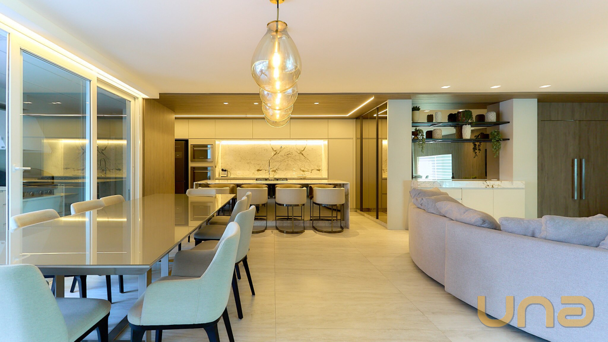 Na área social, o piso em crema marfil reflete a luminosidade natural, enquanto os painéis sob medida da Gava e detalhes arquitetônicos atemporais dão identidade ao espaço.