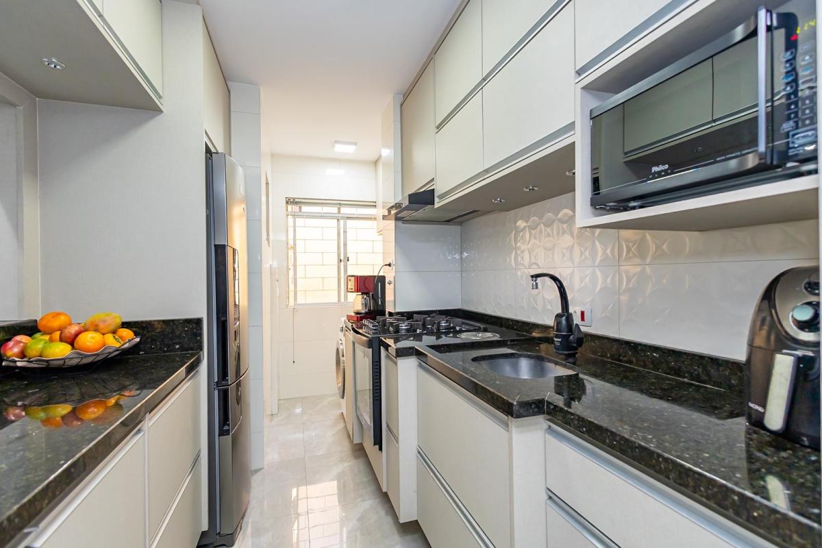 O apartamento conta com 3 quartos, sendo 1 suíte, proporcionando privacidade e aconchego. Os ambientes são integrados, destacando a moderna sala de estar e a sala de jantar, perfeitas para receber amigos e familiares. A cozinha americana, planejada e equipada com armários, é um convite para momentos de descontração e gastronomia.